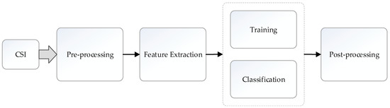 The framework of RDFID is presented in Figure 2. The system has four modules: pre-processing; feature extraction; classification; and post-processing. There are various kinds of noise in the raw collected CSI data, and most noise is removed in pre-processing module. We extract wavelet variance as the real-time feature from frequency domain in feature extraction module. In the classification module, a portion of data is utilized to train a system to be universal that can be adaptive to different scenarios. In the post-processing module, the classification result is further processed to be closer to reality.