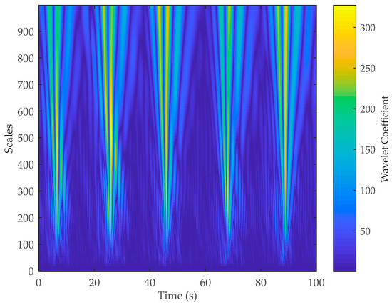 A proper feature is critical in classification tasks. Generally, the moving speed of a person is constant in a short period, and some periodicity exists when the person is moving. For instance, when the person walks, two steps construct a period. However, it is a challenging task to analyze the periodicity directly from the waveform of the wireless signals. During our early exploration, we find that besides time-domain features, frequency-domain features can better characterize the waveforms in intrusion detection. As a result, in order to explore a scenario independent feature, we utilize time−frequency analysis on the waveform. Continuous Wavelet Transform (CWT) combined with wavelet variance is a proper tool to analyze the periodicity of the waveform. First, the wavelet coefficient of the first principle component of the CSIs after low-pass filter (cpl) is calculated utilizing CWT in Equation (5):