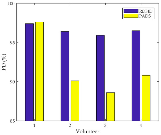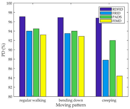 As illustrated in Figure 11, the PD of RDFID is the highest and stable under the three different moving patterns benefiting from the frequency–domain feature.