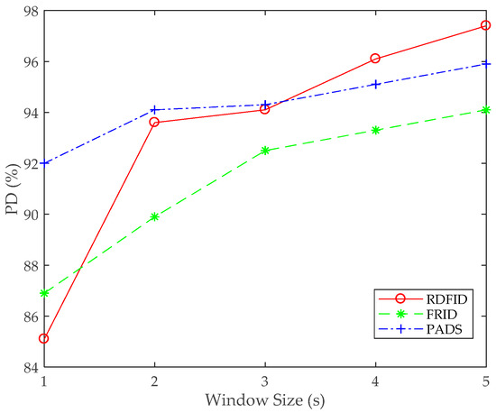 Figure 10 shows the PD of the three approaches when the window size is different. It can be seen that PADS achieves a higher PD when the window size is no larger than 3 s, but the PD of RDFID increases fast as the window size gets larger, and gets the highest of the three approaches when the window size is larger than 3 s.