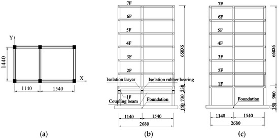Top view and front view of the isolation model and non-isolated model (unit: mm): (a) Top view of the simulated model; (b) isolation model (front view); (c) non-isolated model (front view).