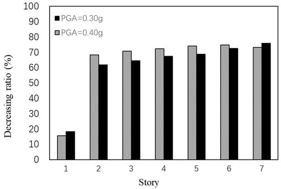 The decreasing ratio of inter-story displacement values in the story-isolated structure after being subjected to earthquakes at PGA of 0.30 g and 0.40 g compared to the non-isolated structure (numerical).