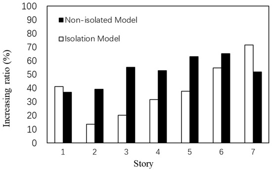 The increasing ratio of peak acceleration values of each story in story-isolated structure and non-isolated structure at PGA of 0.40 g compared to that at PGA of 0.30 g (testing).