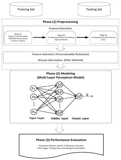 Phases 1 and 2 are discussed in this section, with an overview of the modified vector space representation, mutual information, and MLP model. Phase 3 is discussed in Section 4.