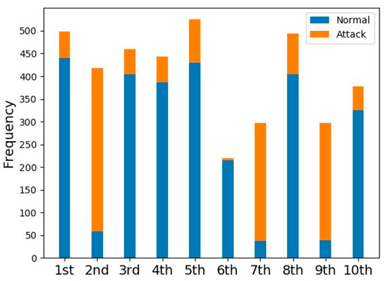 In the following stage, the top 60 and 80 features for 1-gram and top 80 and 120 features for 2-gram are selected based on their information value using mutual information, and are combined for training the model. The numbers 60, 80, and 120 are chosen to reduce the data size and to have good representation of the data. Figure 5 shows the distribution of the top 10 2-gram features based on mutual information. We notice clear disparities in the frequencies in the two classes (Attack and Normal). The above preprocessing phase was performed on Ubuntu 17.10 runnig on Core i7 with 16 GB RAM.