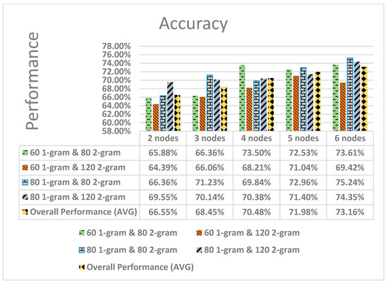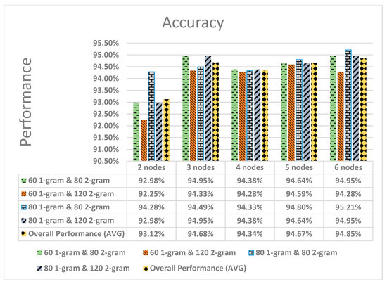 The performance of the model with respect to accuracy value using 2, 3, 4, 5, and 6 nodes and all 1-gram and 2-gram combinations in ADFA-WD.