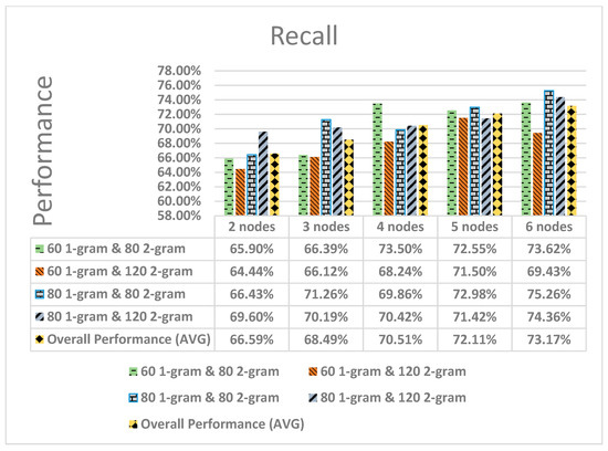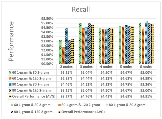 The performance of the model with respect to recall value using 2, 3, 4, 5, and 6 nodes and all 1-gram and 2-gram combinations in ADFA-LD.