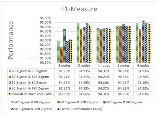 The performance of the model with respect to F1-measure value using 2, 3, 4, 5, and 6 nodes and all 1-gram and 2-gram combinations in ADFA-LD.