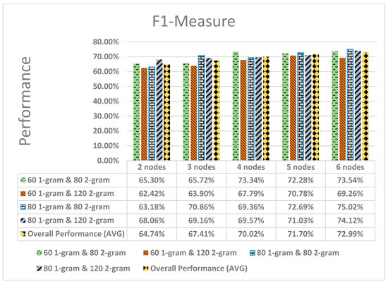 The performance of the model with respect to F1-measure value using 2, 3, 4, 5, and 6 nodes and all 1-gram and 2-gram combinations in ADFA-WD.