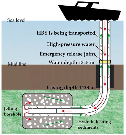 On the basis of this, an innovative exploitation method, namely, the solid fluidization mining method, which is suitable for exploiting non-diagenesis and weakly cemented marine NGH reservoirs, was proposed by Zhou [13,20]. Figure 2 illustrates the schematic diagram of this method [20]. The hydrate-bearing sediment (HBS) is crushed into fine solid particles by a high-pressure water jet at the bottom of the well, and then the fine particles are transported upward along the drilling fluid to the offshore platform. Finally, methane gas is obtained by decomposition, separation, and other postprocessing operations. Furthermore, the solid fluidization method was successfully applied to the trial production of NGH in the Shenhu sea area of the South China Sea [13,14]. The successful application of the solid-fluidization method shows that it is feasible to exploit NGH with a high-pressure water jet.