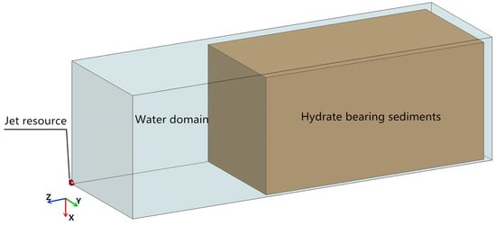 In addition, some explanations deal with the parameters in Table 1. As the mechanical properties tests of in-situ HBS in the South China Sea have not been reported, the parameters in Table 1 are mainly referenced from Ning [27], Clyaton [36], and Luo [38]. Based on in-situ sonic well logging data, the mechanical properties of HBS in the South China Sea were investigated by Ning [27]. According to the change of longitudinal wave velocity of HBS, the parameters were obtained through calculation as follows: The bulk modulus is 6.27 to 9.55 GPa, the friction angle is around 0.218 rad, and the cohesion is 6 to 500 kPa. Through laboratory testing of HBS with 36% saturation, the bulk modulus of 9.4 GPa and the shear modulus of 4.4 GPa were obtained by Clayton [36]. Additionally, Luo [38] acquired the cohesion of 45 kPa based on triaxial loading experiments of the remolded HBS of the South China Sea, in which the hydrate saturation is 32% [38]. In particular, the mean hydrate saturation of HBS in the Shenhu area of the South China Sea is 33% [39], and the hydrate saturation in the experiments of Clayton [36] and Luo [38] is almost equal to that. In this paper, the HBS with a hydrate saturation of 33% in the Shenhu area of the South China Sea is taken as the object of water jet erosion. As a consequence, the bulk modulus of 9.4 GPa, the shear modulus of 4.4 GPa, and the cohesion of 45 kPa were adopted for the material model of HBS.