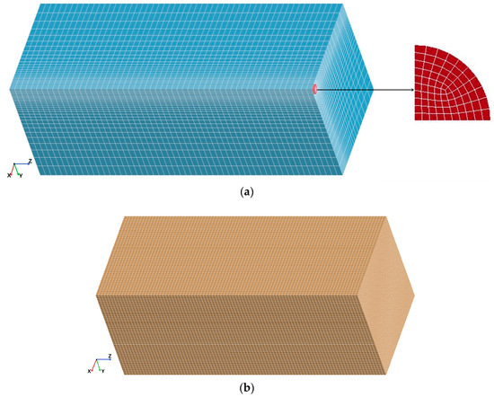 The mapped meshing approach is used to mesh the simulation model of HBS erosion by a water jet. Obviously, there are local effects in the eroding process; therefore, mesh refinement is carried out in the center of the water domain to improve computation efficiency. Meanwhile, all of the components of the geometric model are meshed by ALE elements, including the jet source, the water domain, and the HBS. The finite element mesh consisted of the usual 8-node brick elements, and the total number of elements of HBS is 243,360. The model mesh of the jet source, water domain, and HBS are illustrated in Figure 4. In addition, the interaction between the two meshes is based on fluid-solid coupling, and the coupling is realized by defining the keyword *CONSTRAINED-LAGRANGE-IN-SOLID [34]. With respect to the setting of boundary conditions, two symmetry planes are defined to realize the numerical computation and the displacement of the bottom of the model is limited to ensure that the HBS does not move during water jet impingement. Meanwhile, non-reflecting conditions are applied to the boundary of the simulation model to eliminate the reflection of the stress waves and simulate an unlimited boundary.