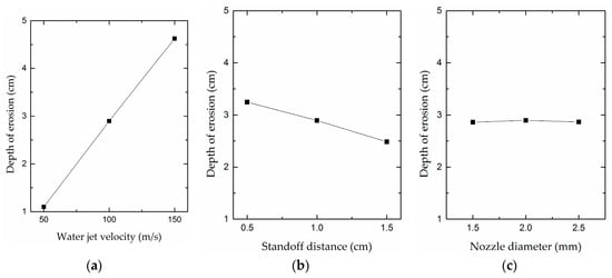 As shown in Table 4, > > . Therefore, as for the erosion depth, the jet velocity is the most significant factor, followed by the standoff distance and then the nozzle diameter. Meanwhile, the erosion depth of the seventh test in Table 3 is the largest at 4.976 cm. Therefore, the work parameter combination of the seventh test, namely, 313, is optimal, and the corresponding jet velocity, standoff distance and nozzle diameter are 150 m·s−1, 0.5 cm and 2.5 mm, respectively.