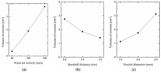 Trend chart of the erosion volume variation of HBS. (a) Water jet velocity; (b) standoff distance; (c) nozzle diameter.
