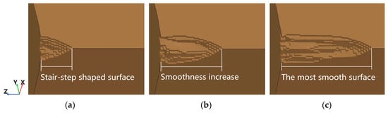 The shape of the erosion hole of HBS at different jet velocities with a standoff distance of 1.5 cm is shown in Figure 7. The erosion depth of HBS increases when the jet velocity increases. The surface of the erosion hole is rough, and stair-step shaped when HBS is eroded at a low jet velocity, and an increase in jet velocity increases the smoothness of the crater. The analysis considers that, under the submerged condition, the momentum exchange between the water jet and the surrounding water occurs, and the jet velocity decreases gradually. When the velocity at the edge of the jet decreases to a certain extent, the HBS cannot be eroded. The higher the jet velocity, the longer the cutting ability of the water jet is maintained, and the smoother the surface of the erosion crater.