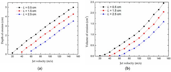 The jet velocity influence on the depth of erosion and the volume of erosion is illustrated in Figure 8. In Figure 8a, the erosion depth increases linearly with the jet velocity, which is consistent with the test results of rock breaking by a jet of Momber [41,42] and Lu [43]. Moreover, when the jet velocity is constant, a smaller standoff distance leads to greater depth erosion. This indicates that the increase in jet velocity is beneficial to the erosion of HBS, and the smaller the standoff distance, the better.