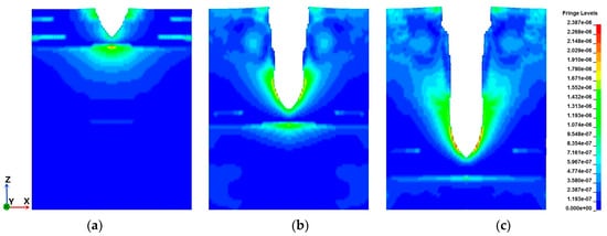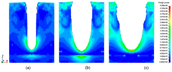 The stress distributions of HBS at different jet velocities, with a standoff distance of 1.5 cm and a nozzle diameter of 1.5 mm, are illustrated in Figure 9. It can be seen that the erosion width of the crater orifice and the erosion depth increase with the increase in jet velocity, and the stress concentration zone at the bottom of the pit at a jet velocity of 140 m·s−1 is significantly larger than that of the former two. This result indicates that the increase in jet velocity truly enhances the vertical erosion and the erosion of the side of the crater by the rebounding water.