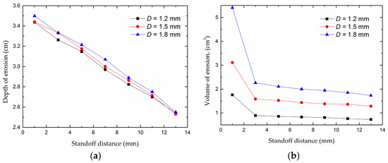 The erosion depth and the erosion volume with change in standoff distance. (a) Depth of erosion; (b) volume of erosion.