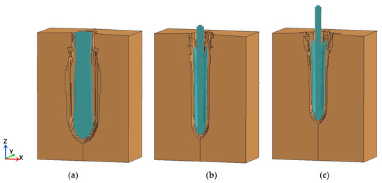 Erosion hole shapes of HBS at different jet velocities. (a) ; (b) ; (c) .