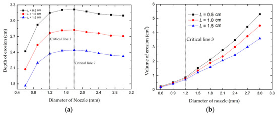 The erosion depth and the erosion volume versus nozzle diameter. (a) Depth of erosion; (b) volume of erosion.