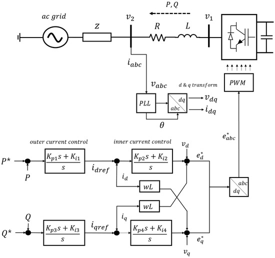 where the is the voltage at PCC and is the voltage at the converter. In addition, and are the resistance and inductance, respectively, and is the current flowing to the AC grid. Filter components prevent the generation of harmonic current by the converter, and they also affect the stability between the AC grid and the VSC.