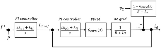 Depending on (9), the d-axis current flowing to the AC grid to control active power is represented in Figure 3. Following the block diagram, the stability between the AC grid and converter can be analyzed based on the initial operating point of the VSC. However, the detailed small signal analysis is not of interest in this paper, and the useful results were given with an impedance-based stability analysis theorem by References [23,24].