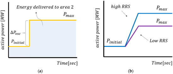 The RRS(k) is a droop-based desired ramp-rate; and are the max and min ramp-rate slopes of , respectively; is the difference between and and ; and are the lower and upper bands of dynamic change of active power variation; and is the difference between and and . As mentioned previously, if the converter receives a high order by the TSO, the active power sharply increases with a ramp rate of , and a large active power is transferred from area 1 to area 2. Based on References [16,17], it was confirmed that converter power control is helpful when the power system has a contingency event; therefore, this control strategy largely contributes to the frequency stability of area 2. However, we can also expect that the angle stability of area 1 could be further worsened. On the other hand, if the converter reaches when the is smaller than , a small amount of active power is delivered to area 2, and the angle stability of the PGs in area 1 will be more improved than that in the case.