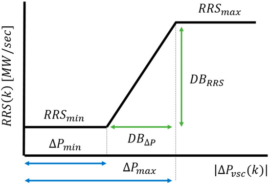 The RRS can vary depending upon , which is the absolute value of the deviation between and the active power reference as If the is large, a high RRS is applied so as to ensure a fast response. On the other hand, if the power order as is small, a low RRS is applied to follow the final value. Such a droop characteristic is given in Equation (11) with Figure 5.