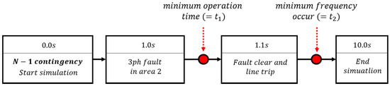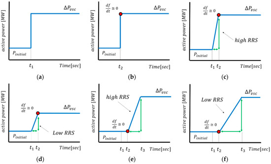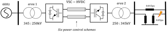 The interconnected grid configuration for simulation studies is represented in Figure 9, and the three-phase fault event at 345 kV AC transmission occurs in area 2. The detailed system parameters are defined in Table 2. The averaged equivalent circuit of the two-level VSC is used for this feasibility study, and it was supplemented by one on-state switch resistance in each phase, and an equivalent current source at the DC side. Note that the VSC model should be injected by current sources in the PSS®E program, and the outer and inner current controller parameters are adjusted to achieve the desired system response. Accordingly, the six different power output characteristics of the VSC-HVDC are simulated, as shown in Figure 10. There are two power control start times of and . (a), (c), and (d) supply power at , and (b), (e), and (f) control power at . The RRS and power reference values are all different according to each control characteristic.