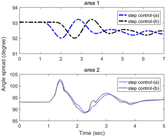 The results in Figure 11 show the angle spread of two interconnected grids with the control scheme as (a) and (b). Both control schemes are step control strategies, and we aimed to determine whether the active power should be transmitted at or . In area 1, the only difference between the two schemes is the power release time, so we may see only the result of area 2. From the angle spread results of area 2, it can be seen that sending power at can further improve the angle stability. More specifically, the first damping of angle spread as after the contingency event is mitigated at about 1.45 s, and the recovery characteristic is more improved from 2.1 s to 3 s. This is because the power from area 1 contributes to the frequency recovery characteristic of area 2. However, in (a), the power is transmitted immediately after the fault, so it contributes less to the angle stability of area 2. The reason for this is that the initial frequency drop driven by fault is momentarily increased due to the immediate active power support. Therefore, the PGs of area 2 generate a relatively small amount of power according to the small frequency drop. However, this process finally makes a slow frequency recovery, and the angle stability of the PGs becomes worse than that in (b). Therefore, we can conclude that sending power during the frequency recovery stage is more beneficial to both TSOs.