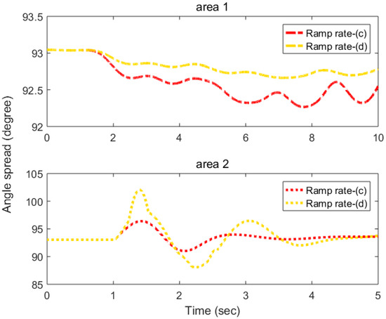 Figure 14 shows the results regarding (c) and (e). Both control schemes are ramp-rate control strategies with the same RRS, and the only difference is the power sending time. In (c), the power is transmitted immediately following the contingency event (=) while the power is increased during the frequency recovery stage (=) in (e). As shown in the result of area 2, if the grid operator uses both ramp-rate control schemes, sending power during the frequency recovery stage shows more stable results in terms of the angle stability. This is because, as mentioned earlier in Section 5.1.1, the initial frequency drop will not be immediately reduced by (c). This characteristic causes the PGs of area 2 to generate less power. Therefore, at about 1.3 s the first damping angle is more mitigated with (e); thus, sending power at is more suitable for both TSOs.