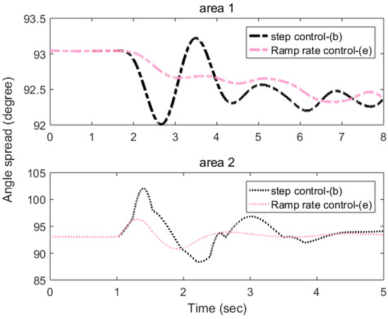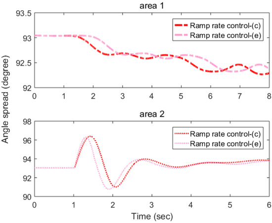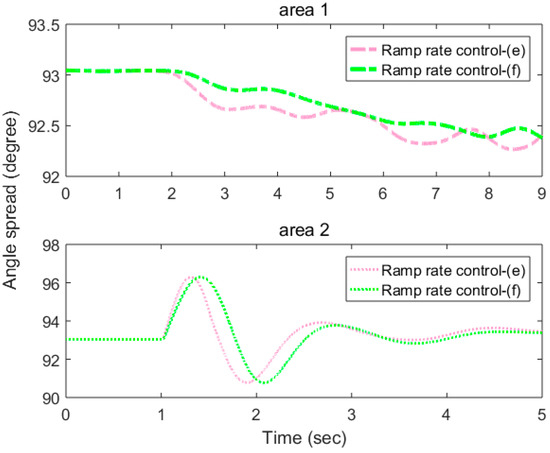 The results in Figure 15 and Figure 16 are about (a) and (e), and (b) and (e), respectively. The main purpose of this simulation is to compare the step control and ramp-rate control strategies; thus, this comparison is the main result of this paper. The results explicitly show that the angle stability with the step control is more unstable in both areas. Using scheme (e) has more smaller value of than (a) as shown in Table 4. As a result, the VSC-HVDC connecting two different grids should have its own RRS considering both the sending and receiving side generator stability. Thus, it is recommended that the two TSOs should include the ramp-rate control clauses in the HVDC design phase when the interconnected mutual agreement is introduced.