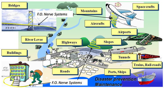 Figure 1 shows schematically smart structures and smart materials that can feel their pain, based on the fiber optic nerve systems. The fiber optic nerve systems can also be used, besides the social infrastructures, for airplane bodies, trains, ships, and natural structures, as shown in Figure 1.
