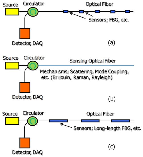 Figure 2 shows fiber sensing systems that can act as the fiber optic nerve systems. Figure 2a–c show, respectively, multiplexed, distributed, and quasi-distributed fiber optic sensing systems. In the multiplexed one, a number of point sensors are set along an optical fiber, which sense, for example, the strain and/or temperature applied to the fiber. As the sensing element, fiber Bragg gratings (FBGs) are mainly used [1]. However, in this technology, we cannot have any information regarding when events take place at the fiber portion without setting the sensing element. From such a point of view, the distributed sensing systems shown in Figure 2b are more suitable. In the technology, the scattering phenomena caused in the fiber are mainly utilized as the sensing mechanism, such as Brillouin, Raman, and Rayleigh scattering. In the case where we do not need to have fully distributed information along the fiber, but we cannot expect the points to be measured exactly, quasi-distributed sensing technologies make sense. In this technology, for example, long-length FBGs are used as distributed sensing elements, which are set along the fiber as shown in Figure 2c.