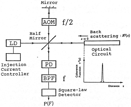 References [15,16] describes the proposal of the SOCF technology as a way to realize distributed sensing. Figure 3 shows basic setup of the SOCF [16]. The light source is a laser diode (LD), which modulates the lightwave frequency directly through simply changing the injection current. Namely, the lasering frequency of LDs is easily changed. This setup is a heterodyne interferometer with an intermediate frequency f setting by an acoustic optical modulator (AOM). The interference component is selectively acquired by a band-pass filter (BPF) of the center frequency f and a square low detector.