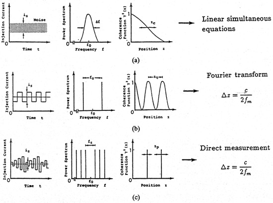 Figure 4 shows early trials to synthesize optical coherence functions [16]. Figure 4a shows the line-width manipulation that occurs from injecting a noise current into the LD. By changing the noise current amplitude, the LD line width Δf is changed, which corresponds to changing the coherence length of the LD. The reflectometry function can be realized by solving a set of linear simultaneous equations by using the data obtained from changing the coherence length. When the current is modulated with a square waveform as shown in on the left-hand side of Figure 4b, the spectrum of the two lines is synthesized in a time-averaging manner, as shown in the center of Figure 4b. This corresponds to the synthesis of a sinusoidal-shaped optical coherence function, as shown on the right-hand side of Figure 4b. With changing the line spacing fs, which corresponds to changing the period of the sinusoidal optical coherence function, datasets are acquired. By applying inverse Fourier transform to the data, the distribution of the reflected lightwave can be calculated. In this case, the spatial resolution Δz is expressed as the equation shown in Figure 4b, where fm is the maximum line spacing, and c is the lightwave velocity in vacuum. Another way to have the distributed measurement function is to modulate the LD current by the waveform shown on the left-hand side of Figure 4c. A multi-line spectrum with identical separation can be obtained as shown in the center of Figure 4c. This modulation realizes a series of delta function-like optical coherence functions, as shown on the right-hand side of Figure 4c. When the measurement range is restricted within the coherence peak separation, the position selective measurement at the coherence peak position can be realized. Therefore, distributed measurement of the lightwave reflection can be done by changing the coherence peak position through changing the line spacing fs. Here, the spatial resolution Δz is expressed as the equation shown in Figure 4c, where fm is the frequency spacing between the two lines at both edges of the multi-line spectrum. The interval between the delta function-like coherence peaks is expressed as zs = c/fs, where fs is the line spacing shown in Figure 4c.