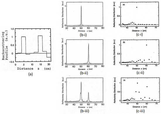 Figure 5 shows the experimental results that demonstrate the distributed measurement by the SOCF technology. Figure 5a–c corresponds to the case shown in Figure 4a–c, respectively. In Figure 5a, reflections at two half mirrors are measured. In Figure 5(b-i),(c-i), reflection at a half mirror set at a 50-cm position is measured. In Figure 5(b-ii),(c-ii), reflection at a half mirror set at a 60-cm position is measured. In Figure 5(b-iii),(c-iii), reflections at the two half mirrors are measured. All three cases worked well as the distributed measurement scheme [16].