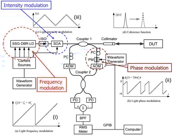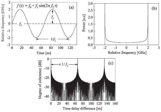 By totally using FM, IM, and PM, an almost arbitrary-shaped optical coherence function can be synthesized [22]. Examples are shown in Figure 8b,c. A periodical triangle-shaped coherence function is synthesized in Figure 8b. A trapezoid-shaped one is shown in Figure 8c.
