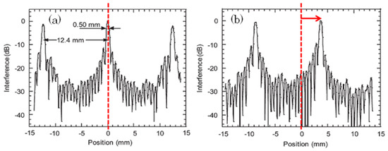 Parallel shift of the synthesized optical coherence function by using phase modulation, which has a similar waveform to the FM waveform [22]. Figure 7a shows a synthesized delta-function-like optical coherence function without the shift along the position axes, and Figure 7b shows that shifted by the phase modulation, respectively.
