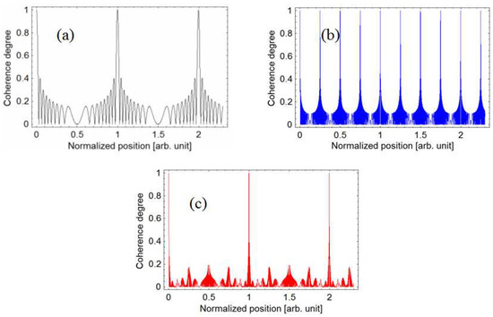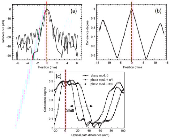 When using additionally the phase modulation, which must be the same waveform as the FM waveform (see Figure 6ii), we can shift the whole coherence function along the lightwave propagation axis [24], for example, as shown in Figure 7b [22]. The phase modulation (PM) waveform is basically the same shape as the FM. In practice, the PM waveform is folded within +π and −π, as shown in Figure 6ii. When we change the PM amplitude, the synthesized optical coherence function can be shifted. Theoretically, the function to shift the synthesized optical coherence function corresponds to a formula in the Fourier transform theory. In Figure 7b, it is shown that the synthesized optical coherence function can realize the reduced or zero degree of coherence, even in the case of the zero optical path-length difference [22]. This situation cannot take place in the natural interferences.