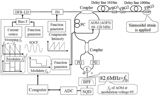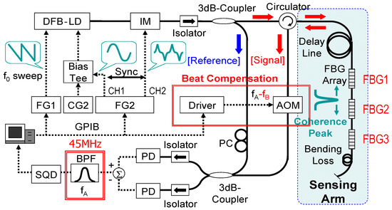 When the FBGs are set along a long-length fiber, for example, of 1000-m length, as shown in Figure 10, an optical path-length difference (OPD) takes place between the sensing lightwave reflected at the FBG and the reference lightwave. In this case, the LD frequency scan with the saw-tooth waveform makes an additional frequency difference between the two lightwaves due to the OPD. Therefore, the beat frequency between the two lightwaves, which is the heterodyne output frequency of the interferometer system, changes for each FBG to be measured. Therefore, we need to add some scheme to manage the heterodyne frequency change. In Figure 10, the amount of the frequency shift set at the acoustic optical modulator (AOM), which is an optical frequency shifter, is changed for each FBG, so that the heterodyne frequency at the system output becomes constant.