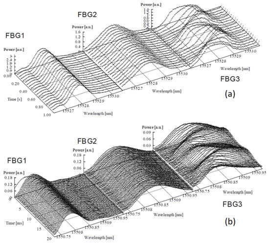 Time-resolved simultaneous measurement of reflection spectra at multiple FBGs with the random accessibility by the setup shown in Figure 10 [28]. (a) Random access measurement of the reflection spectra at the three FBGs, which are located along the fiber as shown in Figure 10, with a total measurement speed of 60 Hz. (b) Random access measurement of the reflection spectra at three FBGs, which are located along a fiber portion of a 10 m length, with a total measurement speed of 10 kHz.