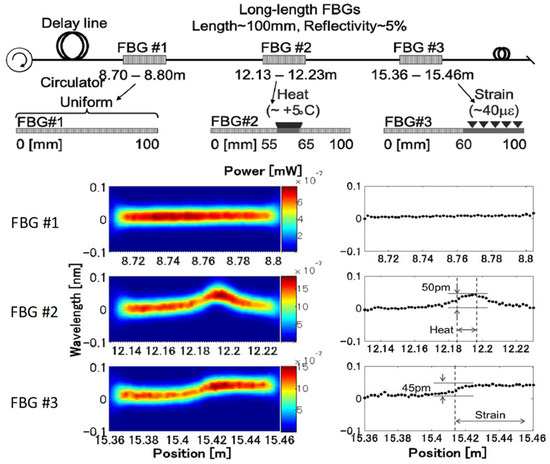 Experimental demonstration of the quasi-distributed sensing in the system that is shown in Figure 13 [31]. Bragg wavelength distribution along long-length FBGs are successfully obtained by the SOCF technology.