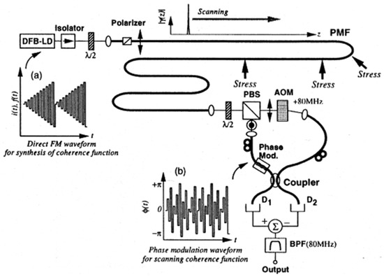 Optical setup for distributed lateral force measurement along a polarization-maintaining optical fiber utilizing polarization modes coupling and the SOCF technology [32]. (a,b) show, respectively, the FM waveform to synthesize the delta-function-like optical coherence function and PM waveform to shift the synthesized optical coherence function along the optical fiber.