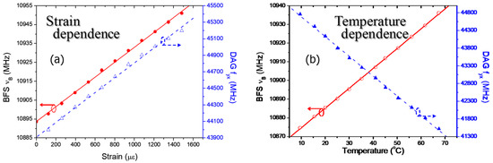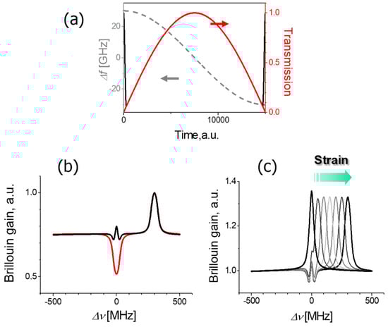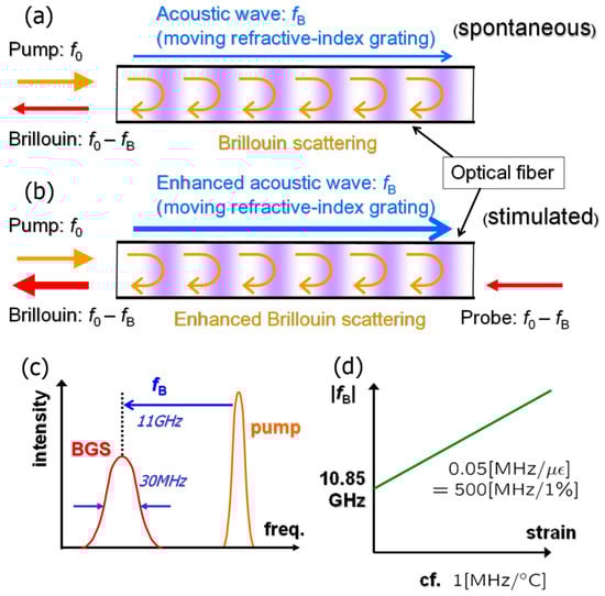 Then, the spectral relation shown in Figure 17c is obtained. The spectral broadening of around 30 MHz is observed in the Brillouin gain spectrum (BGS), which corresponds to the phonon lifetime. The down-shifted frequency fB is called the Brillouin frequency shift (BFS). The BFS shows a linear relationship to the strain change and/or temperature change that are introduced to the fiber. This is the sensing mechanism of the Brillouin scattering for strain and/or temperature.