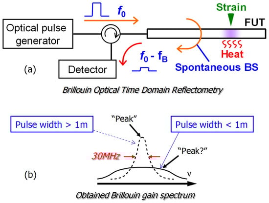 Schematic drawing of Brillouin optical time-domain reflectometry through launching a pulsed lightwave and detecting Brillouin backscattering as a function of time (a). Origin of trade-off between the spatial resolution (pulse width) and the measurement accuracy of strain and/or temperature (line width of the pulse) (b).