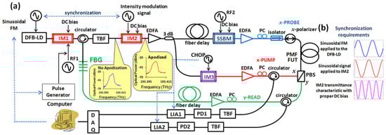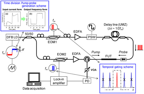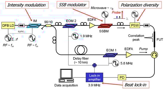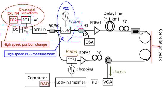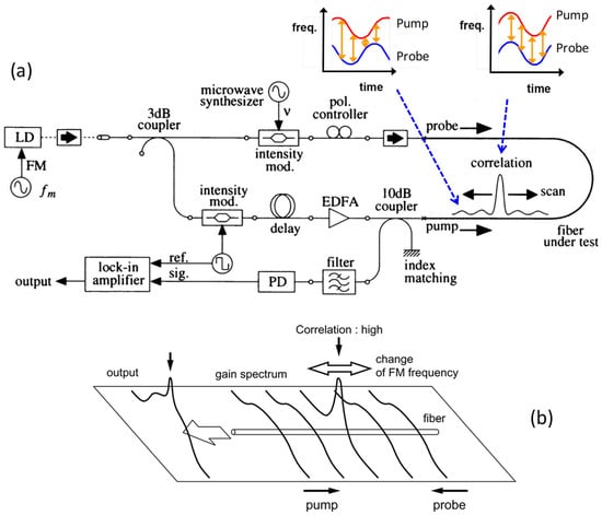 Figure 19a shows the first setup of the BOCDA [8]. The frequency difference between the pump and the probe is generated by an optical intensity modulator driven by a microwave with around 11 GHz of frequency. The carrier-suppressed condition is satisfied, and the first lower sideband is used as the probe wave. The SOCF was performed simply with a sinusoidal frequency modulation to the LD by utilizing its direct frequency modulation nature with the input current modulation. By adjusting the FM frequency and the sensing fiber length, which is the fiber length between the isolator and the 10-dB fiber coupler in Figure 19, only one correlation peak position appears within the sensing fiber portion. Then, the position-selective measurement can be realized. The measurement position, or the correlation peak position, can easily be changed with the FM frequency change. Both the distributed measurement and the random-access measurement can easily be selected.