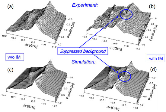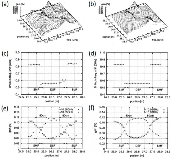 In Figure 20, the experimental results and simulation results are compared in a distributed measurement of BGS [8]. The fiber under test is composed of an ordinary single mode fiber with 10.83 GHz BFS and a 150-cm section with 10.56 GHz BFS. Figure 20a,c,e are for the experiments, and Figure 20b,d,f are for the simulation. Figure 20a,b show the BGS distribution, while Figure 20c,d show the BFS distribution. Figure 20e,f show the intensity distributions for the two BFS of 10.83 GHz and 10.56 GHz, respectively [8].