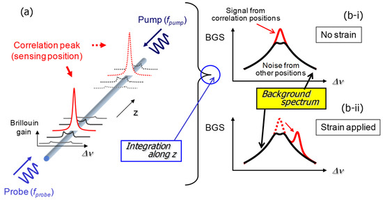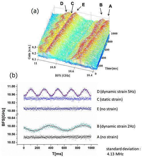 - Shimizu, R.; Kishi, M.; Hotate, K. Enhancement of strain measurement dynamic range in basic BOCDR system with background noise reduction by simple filtering calculation scheme. In Proceedings of the 26th International Conference on Optical Fiber Sensors, Lausanne, Switzerland, 24–28 September 2018; p. WF15. [Google Scholar]