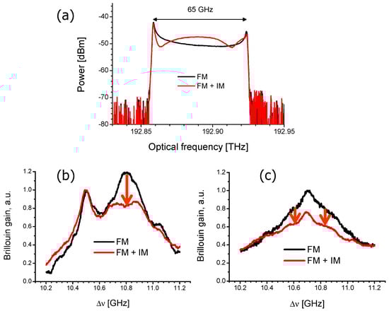 By additionally using the intensity modulation, which is done by a semiconductor optical amplifier (SOA), as shown in Figure 6, the power of each line spectrum can arbitrarily be set by using a waveform, as shown in Figure 6iii [22]. With the intensity modulation, the envelope of the multi-line spectrum can be manipulated. This technique is also familiar in the Fourier transform theory, which is called the “window” or the “apodization”. By the intensity modulation (IM), the side lobes can be reduced, which is shown in Figure 8a as an experimental result [22].